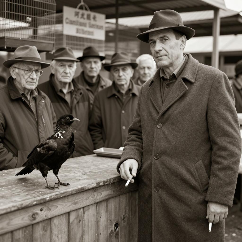 Sepia-toned photograph of a man in a wool coat and fedora standing in a bird market. He holds a cigarette in his right hand and stands beside a wooden counter with a black bird on it. Behind the counter, a group of elderly men in hats and glasses watch intently. The background includes bird cages and signs. The man in the foreground has a neutral expression, and the men behind the counter have varied expressions of curiosity and interest. Five people in total.