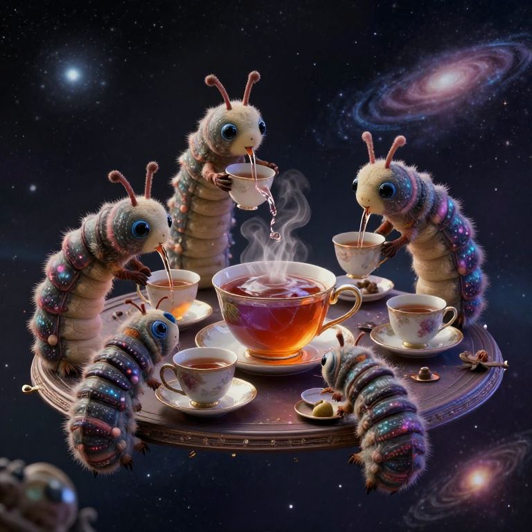 A floating tea party circulates through the galaxy in the arms of star-forged caterpillars, each sipping from cups that pour beverages of forgotten galaxies.