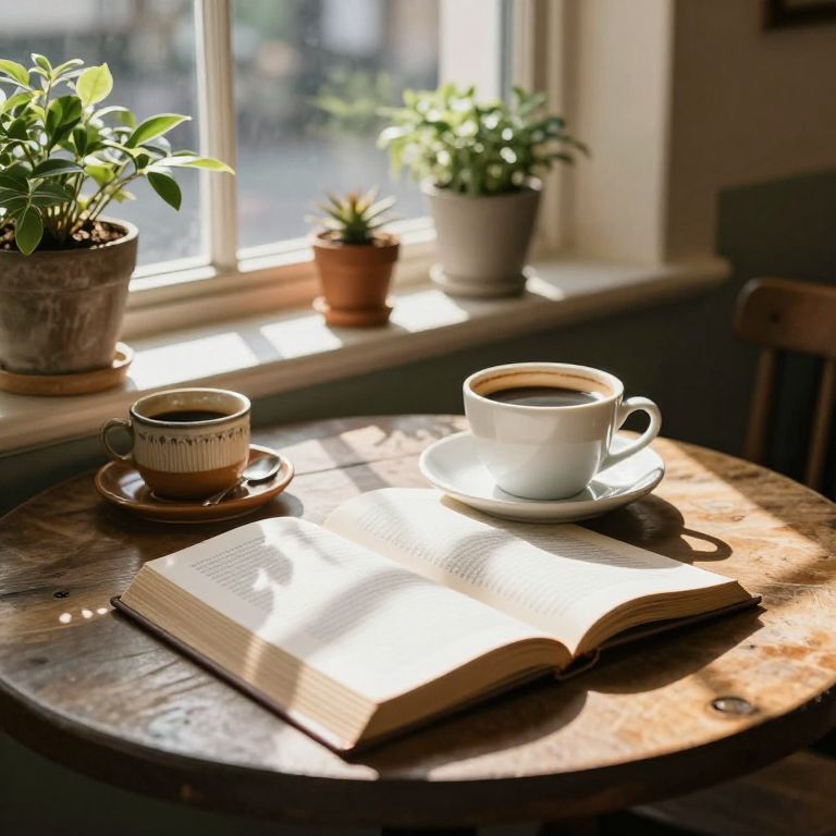 Eading at a rustic café table with freshly brewed coffee, sunlight streaming in from a window, an open book resting on the table, vintage decor and potted plants creating a warm and inviting mood, evoking a sense of calm and inspiration.