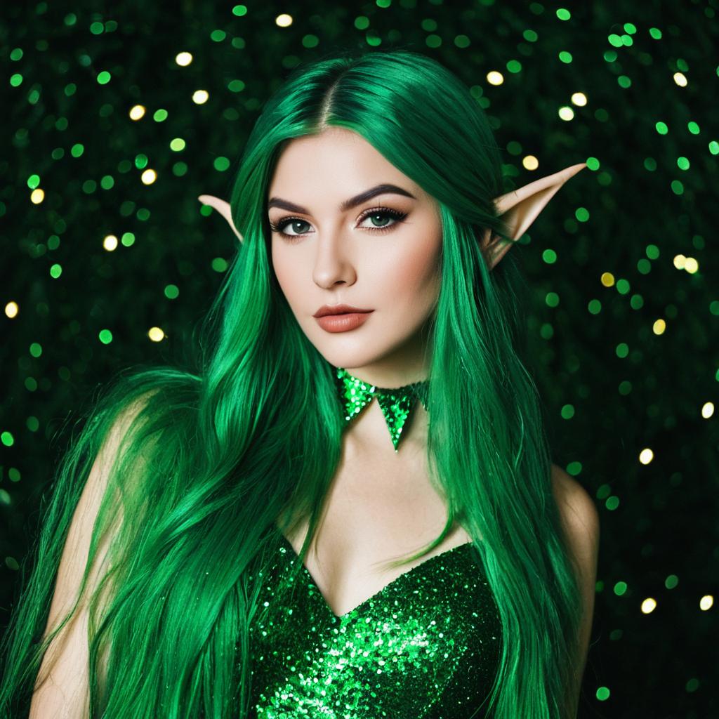 Portrait of a woman dressed as a green glitter elf, featuring long vibrant green hair, pointed elf ears, and a sparkling green outfit with matching choker. The background is decorated with green and gold bokeh lights enhancing the fantasy theme.