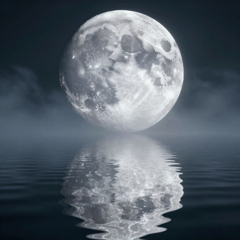 Photographic-style digital image of a bright, full moon centered against a dark, starless night sky. The moon's surface is detailed with craters and textures, illuminated with white and grey tones. Below, a calm, reflective body of water mirrors the moon's image, creating a symmetrical, shimmering reflection. The water's surface is smooth with gentle ripples, and the moon's light casts a soft glow, blending into the misty, grey-blue horizon. The overall color palette is dominated by shades of blue, white, and grey, creating a serene, nocturnal atmosphere.