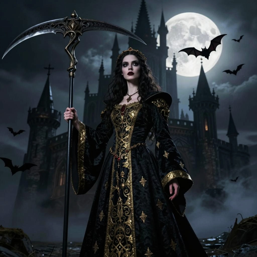 A dark, mysterious woman dressed in an elaborately detailed black and gold medieval robe stands imposing in front of a gothic castle under a full moon. She holds a large, ornate scythe while bats scatter in the stormy night sky, evoking a fantasy and gothic atmosphere with dramatic lighting and intricate costume design.