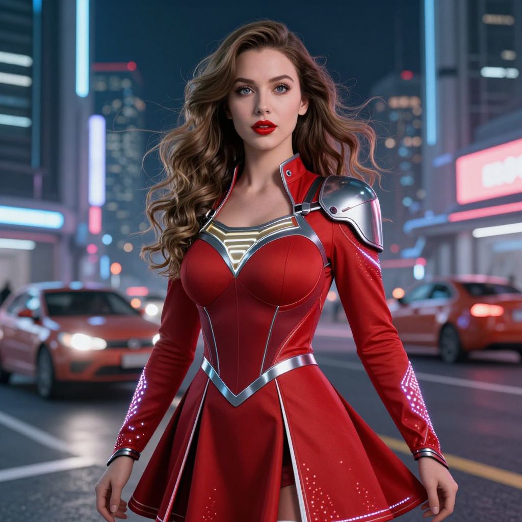 Photorealistic CGI image of a young woman with long, wavy brown hair and fair skin, standing in a neon-lit city street at night. She wears a form-fitting, red superhero dress with metallic silver accents and a V-shaped chest emblem. Her red lipstick matches her dress, and she has a confident expression. The background features blurred, brightly lit buildings and several cars, including a red sedan and a white car, driving on the wet street. The overall style is modern and vibrant, reminiscent of a comic book universe.