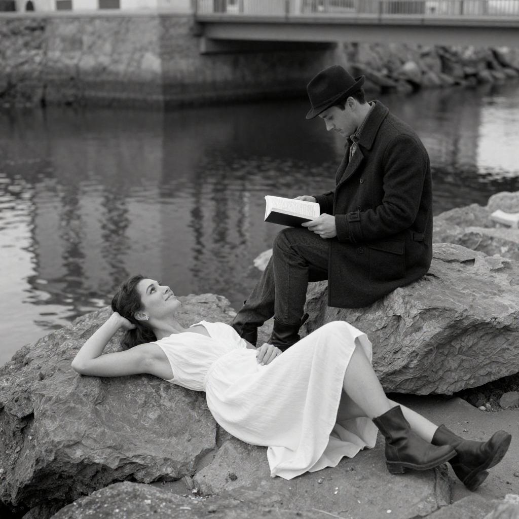 Black-and-white photograph of a man and woman on rocky shore. Man sits, reading, wearing dark coat, hat, boots; woman lies beside him, white dress, relaxed, smiling. Reflective water, stone wall, bridge in background. Man holds book, woman rests arm on rock. Calm, serene atmosphere.