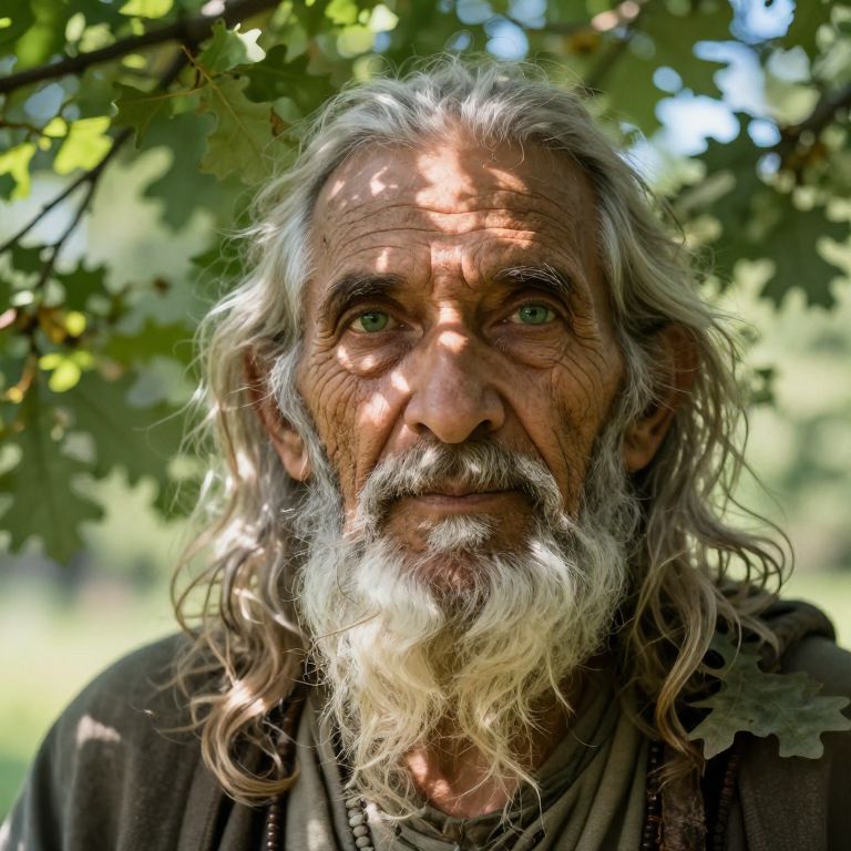 Photograph of an elderly man with long, wavy, white hair and a full, white beard. His green eyes are slightly sunken, and his weathered face is illuminated by sunlight filtering through the leaves of a nearby tree. He wears a dark, worn garment with a leaf pattern on the shoulder. The background is a blurred green, suggesting a forest or park setting. The texture of his skin and hair is detailed, emphasizing his age and experience. The light and shadow create a dramatic, natural effect on his face.
