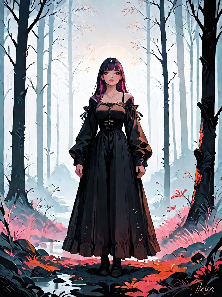 Digital artwork of a full-body dark fantasy depiction featuring a young woman standing in a misty medieval dark forest. She wears a long, flowing black off-the-shoulder dress with voluminous sleeves, and the scene is set with fog and dim torchlight creating an ominous atmosphere. The background includes tall, bare trees with pink and orange foliage near the forest floor, enhancing the mystical mood.