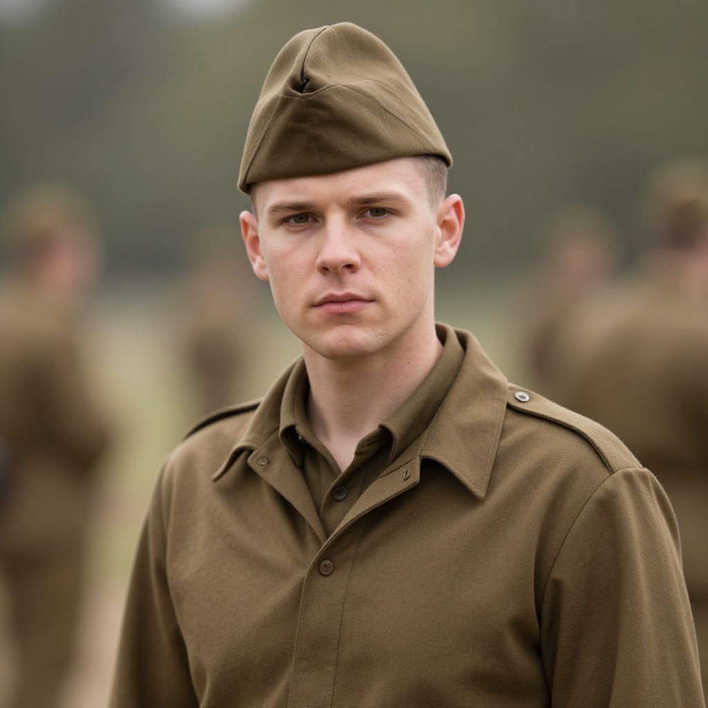 Male army costume, male focus, solo, 1boy, hat, realistic, jacket, uniform, military uniform, military, blurry background, looking at viewer, shirt, military hat, brown shirt, blurry, brown jacket, upper body, pocket, breast pocket, world war ii, day, military jacket, outdoors