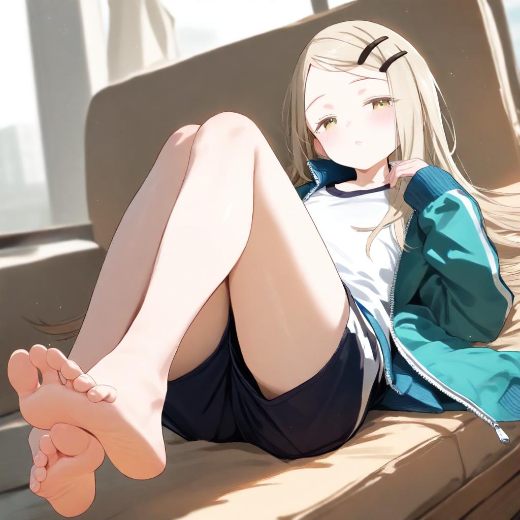 Shinosawa_hiro,1girl,solo,feet,barefoot,long hair,jacket,soles,open clothes,toes,blush,hair ornament,hairclip,looking at viewer,shorts,on back,lying,track jacket,yellow eyes,legs,blurry,blurry background