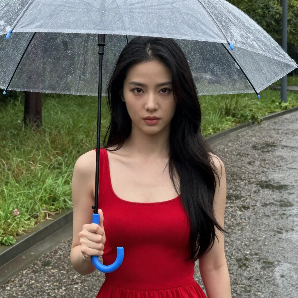 Asian woman with long black hair, wearing a red sleeveless dress, holding a transparent umbrella with a blue handle, standing in the rain on a gravel path. Raindrops on umbrella, intense focus on her face, green grass in background.