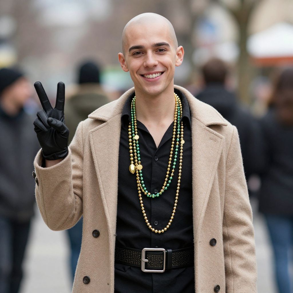 Mardi gras costume male, 1boy, male focus, solo, belt, gloves, jewelry, necklace, bald, outdoors, smile, coat, blurry background, looking at viewer, alien