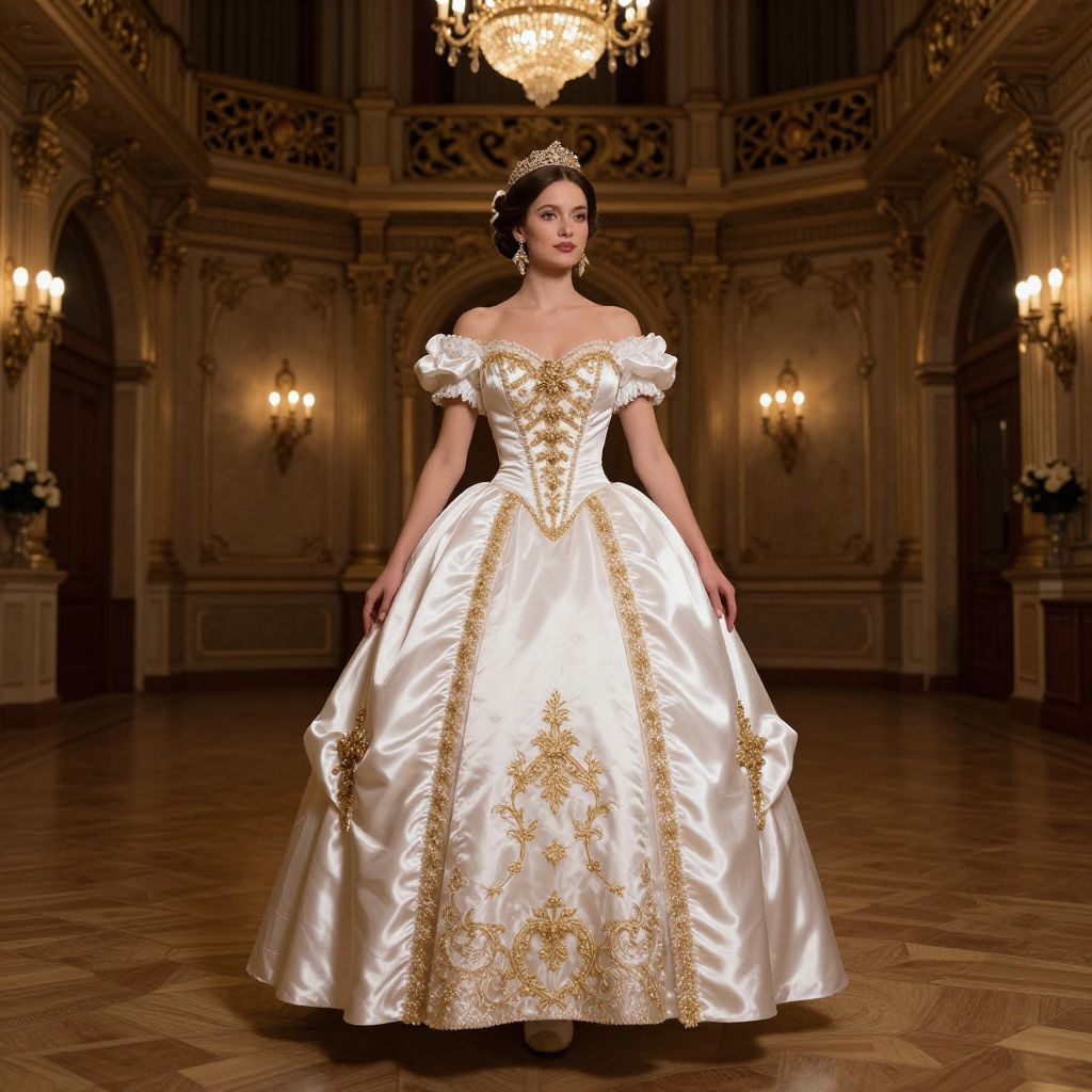 Photograph of a fair-skinned woman with dark hair styled in an updo, wearing a white satin ball gown with gold embroidery and puffed short sleeves. She has a slender build and wears a gold tiara. She stands in an opulent, warmly lit ballroom with ornate wooden walls, chandeliers, and wall sconces. The floor is made of polished parquet wood. The gown's elaborate embroidery includes floral and ornate patterns, and she stands with her hands gracefully by her sides, exuding regality. The background showcases classical architectural details and elegant decor.