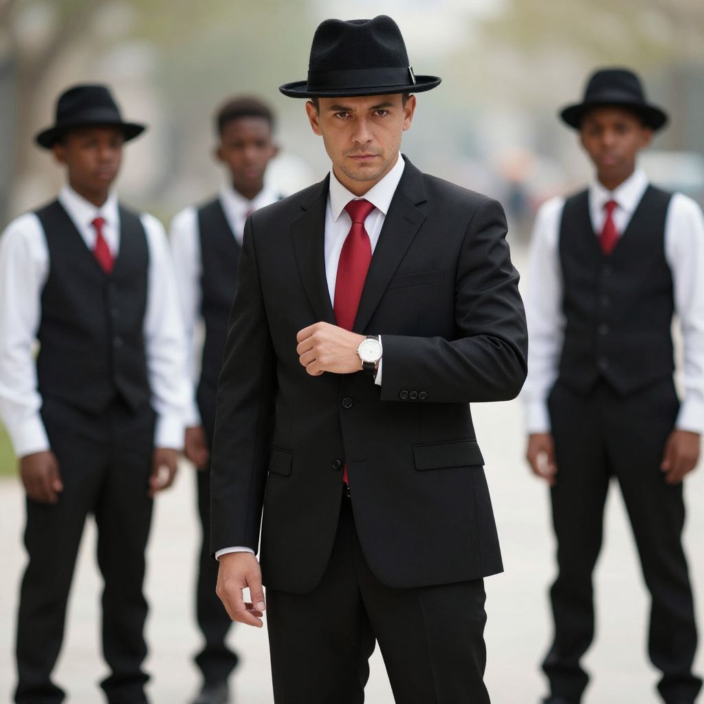 Photograph of a handsome Caucasian man with light skin and short brown hair, wearing a black suit, white shirt, red tie, and black fedora. He stands confidently in the foreground, looking directly at the camera with a serious expression. In the blurred background, three African-American men in similar black suits, white shirts, and red ties, and black fedoras, stand in a line. The background is outdoors with a bright, overexposed white area, and green trees, creating a high-contrast effect. The image has a dramatic, almost cinematic quality.