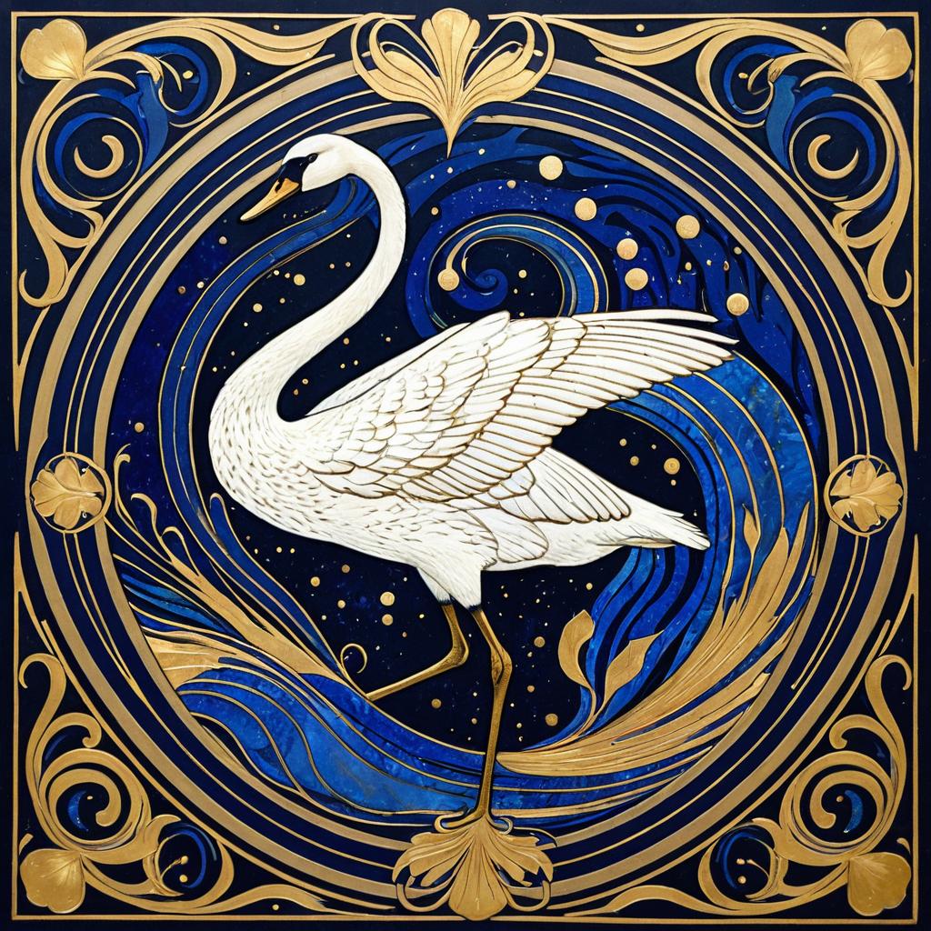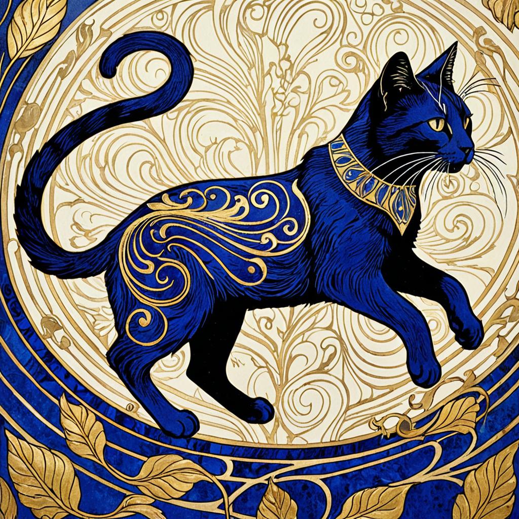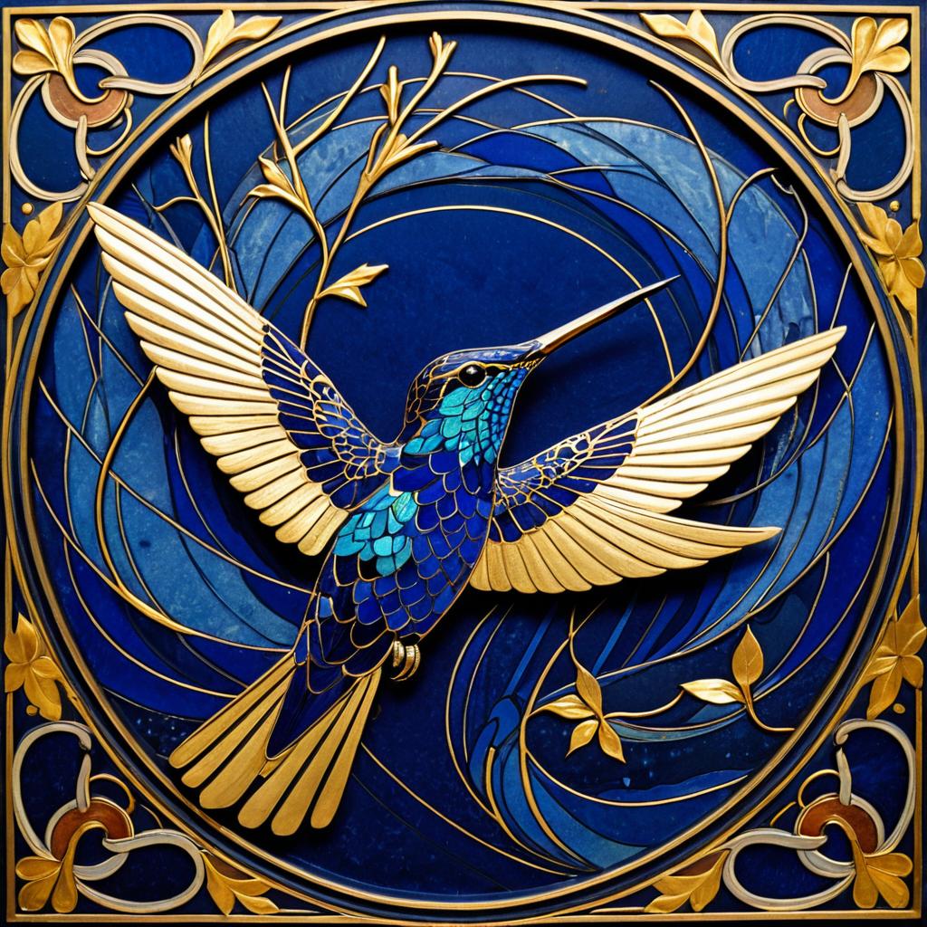 A mythical phoenix with gold leaf and lapis lazuli. Art Nouveau design featuring dynamic, moving elements and patterns, as if caught in mid-motion. fluid, organic shapes and decorative motifs of Art Nouveau with a sense of energy and kinetic movement