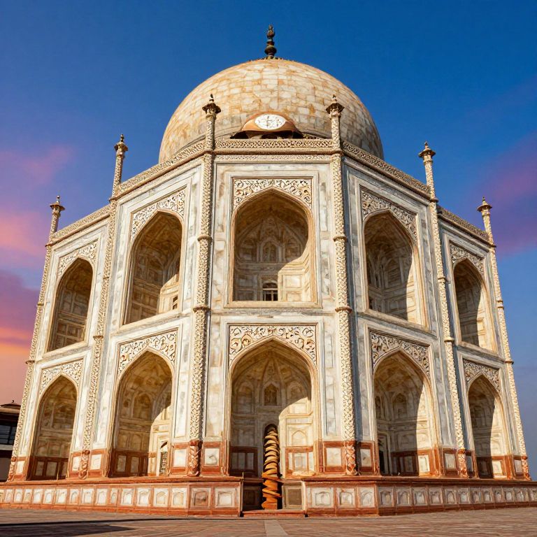 A 360-degree view of a grand, ornate building with intricate details and rich colors, featuring a dome, arches, and a spiral staircase, set against a vibrant sky.