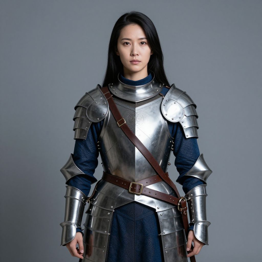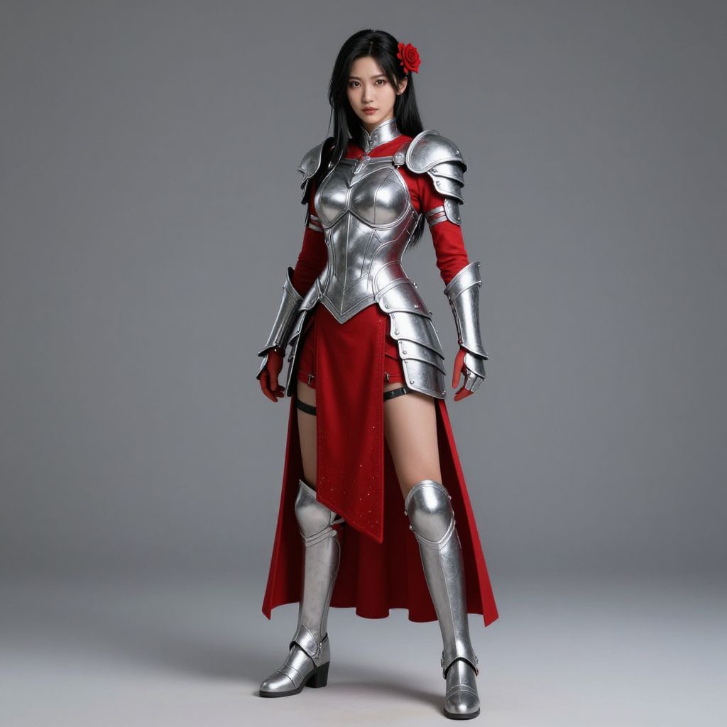 Female warrior woman with a red skirt and silver armor on her body. She has a red rose in her hair and is wearing a pair of silver boots.