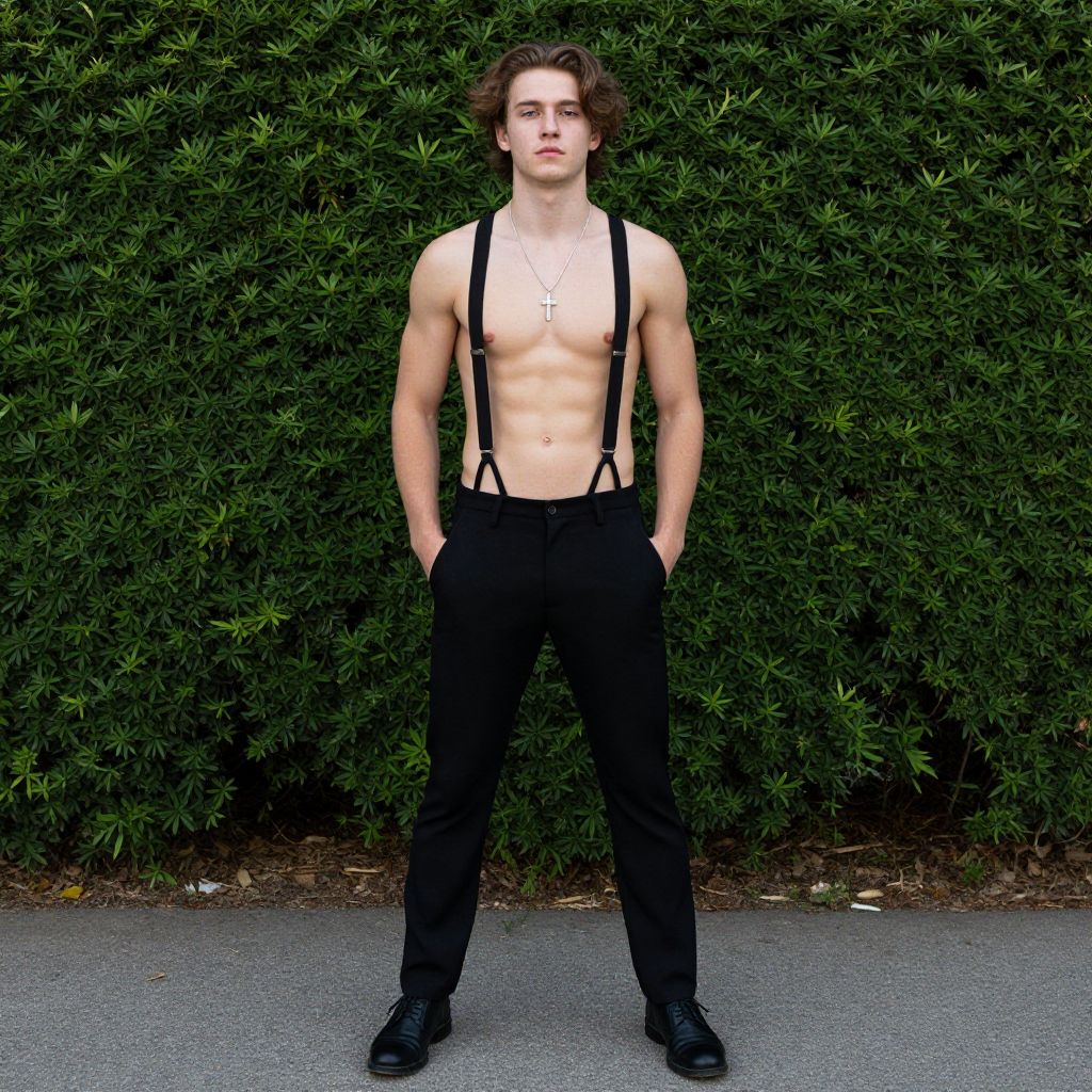 Photograph of a young, white man with wavy brown hair standing confidently in front of a green hedge. He's wearing black suspenders over a bare, muscular chest, black pants, and black shoes. His hands are in his pockets, and he has a silver necklace with a cross pendant. The ground is gray asphalt, and the background is dense, green foliage.