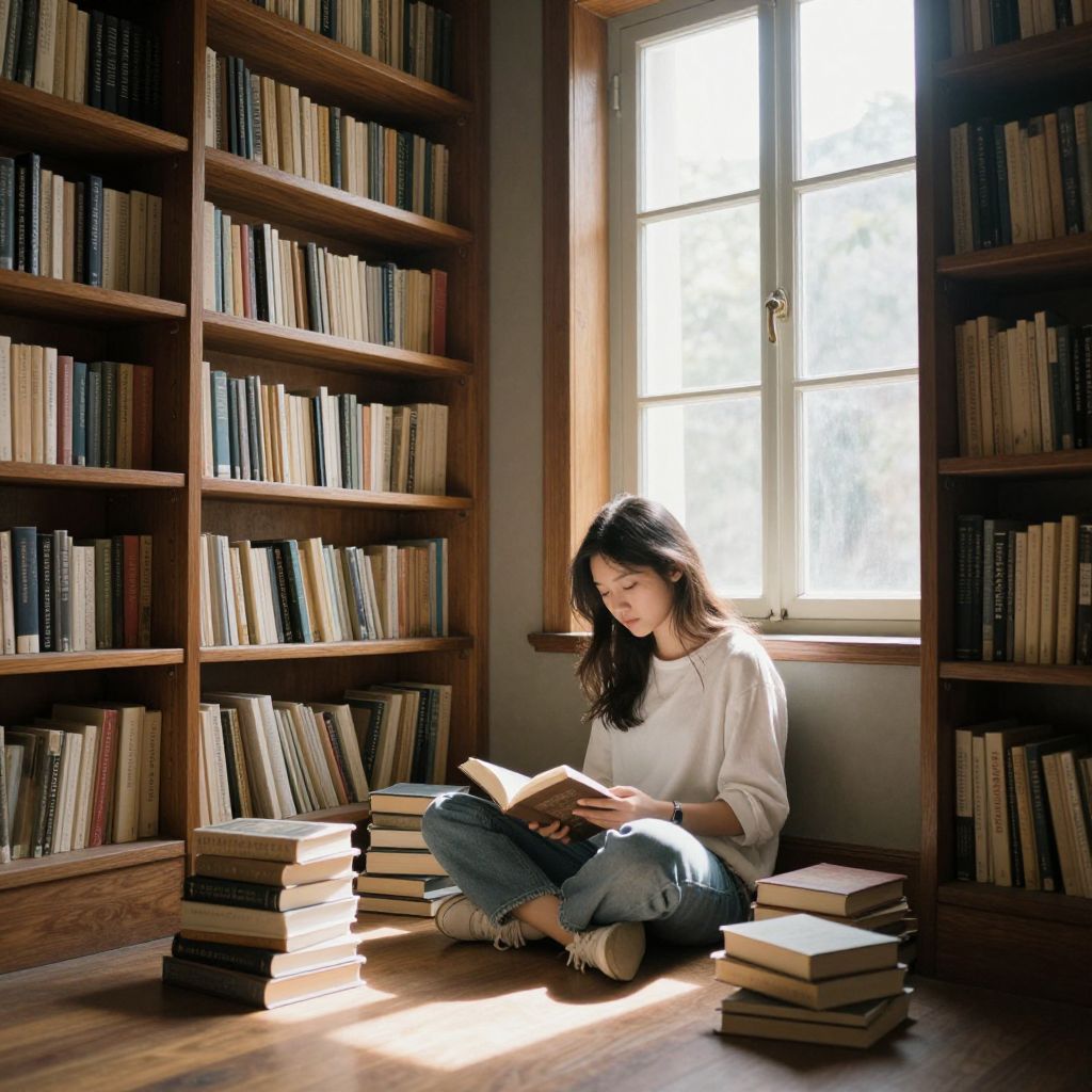 Sunlight streams through a window, illuminating a serene library scene where a young woman sits cross-legged among scattered books, engrossed in reading while surrounded by towering wooden shelves filled with countless volumes.