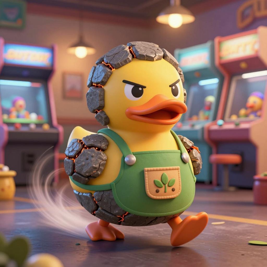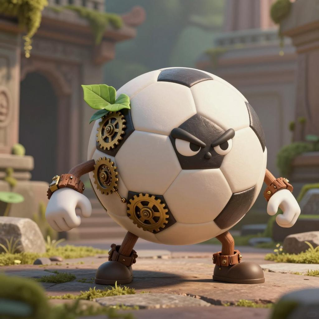 Anthropomorphic soccer ball adventurer character with woven forest vines and leaves body, gardener apron with seed packets, determined and slightly grumpy expression, sliding into frame with motion blur trails in arcade filled with glowing game cabinets, under dramatic rim lighting with strong shadows, children’s book illustration feel, highly detailed, dynamic composition, 8k render