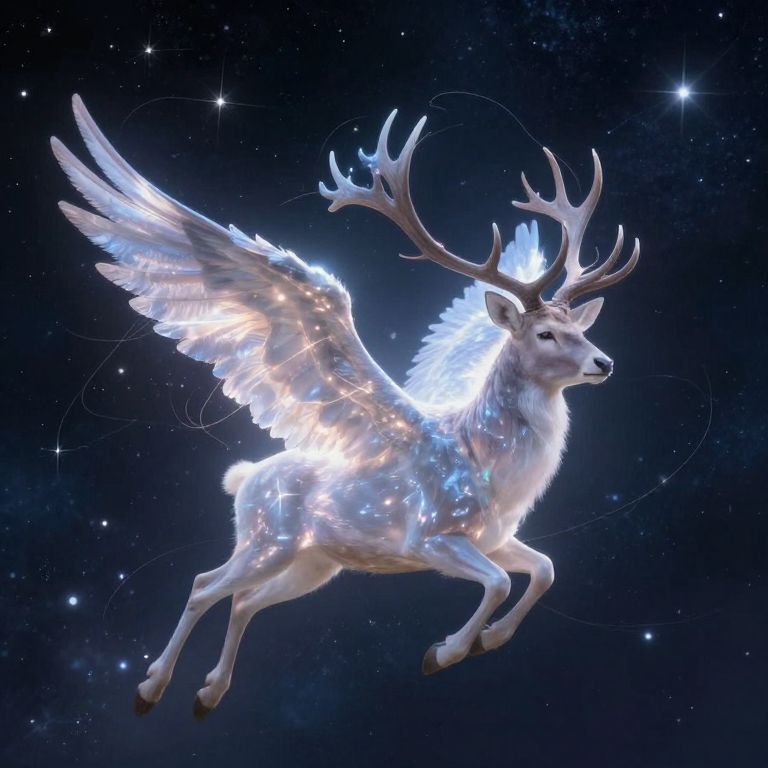 An ethereal stag with wings of light soars through a starlit cosmos, its antlers tracing celestial paths with a whisper of hope and the promise of boundless freedom.
