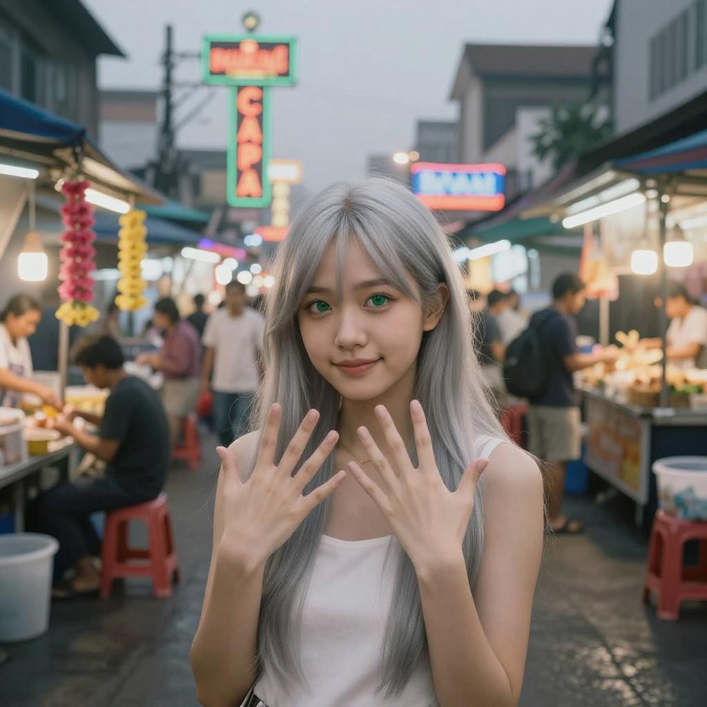 (8k, RAW photo, best quality, masterpiece:1.2), (realistic, photo-realistic:1.37), 1girl with long silver hair and emerald eyes, cute:1.2, neon-soaked Quiapo night market, Manila — crowded food stalls, colorful jeepneys and sari-sari shop signs, hanging strings of sampaguita garlands, narrow wet sidewalks and overflowing vendors, misty evening fog, warm glowing lights, professional lighting, rim light, photon mapping, radiosity, physically-based rendering, PBR, atmospheric perspective, front-facing, whole body, delicate face, soft smile, looking at viewer, five fingers, natural skin, minimal makeup, DSLR street photography, 35mm lens, shallow depth of field, film grain, high contrast, color graded, candid vibe, selfie pose
