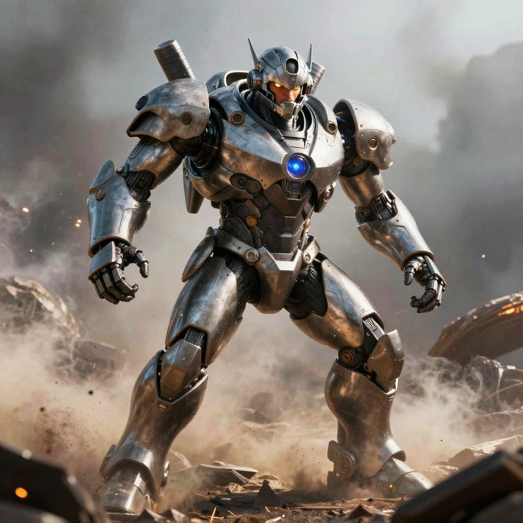 Super Gigachad in an epic battle scene on a dystopian battlefield, surrounded by swirling smoke and sparks, wearing advanced mech exosuit, exuding power and confidence, hyper-realistic lighting highlighting muscular features, cinematic action moment.