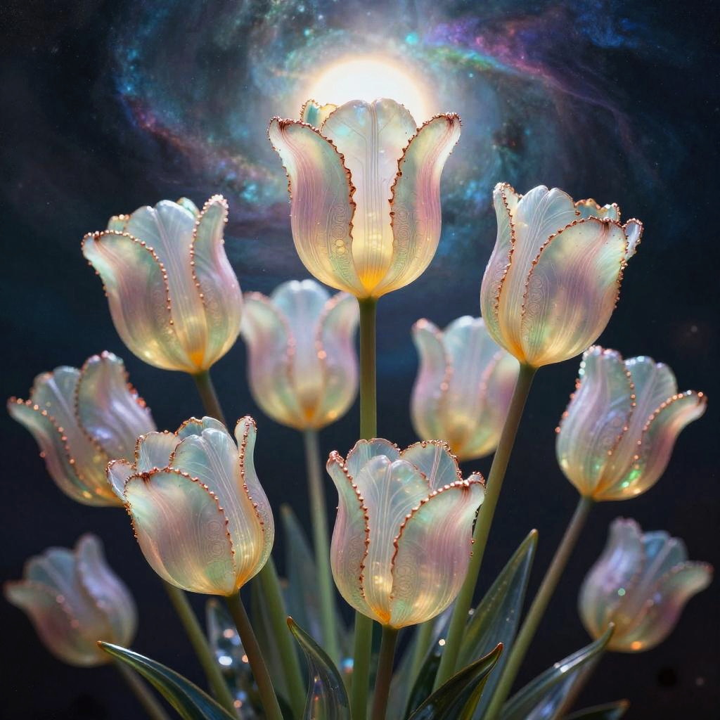 Wide-Angle Distortion Correction nebula camellias (midnight-blue, pearlescent satin petals edged with microstardust, dew like crushed opal) ganglia circuitry fine-structure, intricate detail, brilliant colors, style of gustav klimt, rebecca guay, leonid afremov, flowers coalescing into a living constellation around a pulsing nebula synapse, petals clustering into star-like orbs and linking with luminous filaments