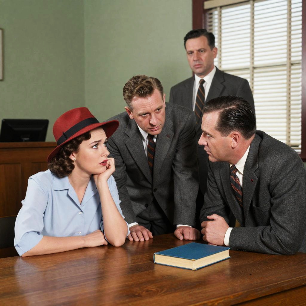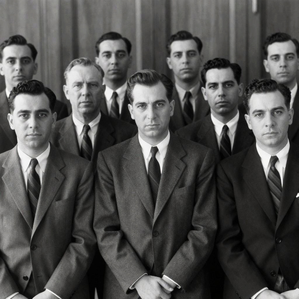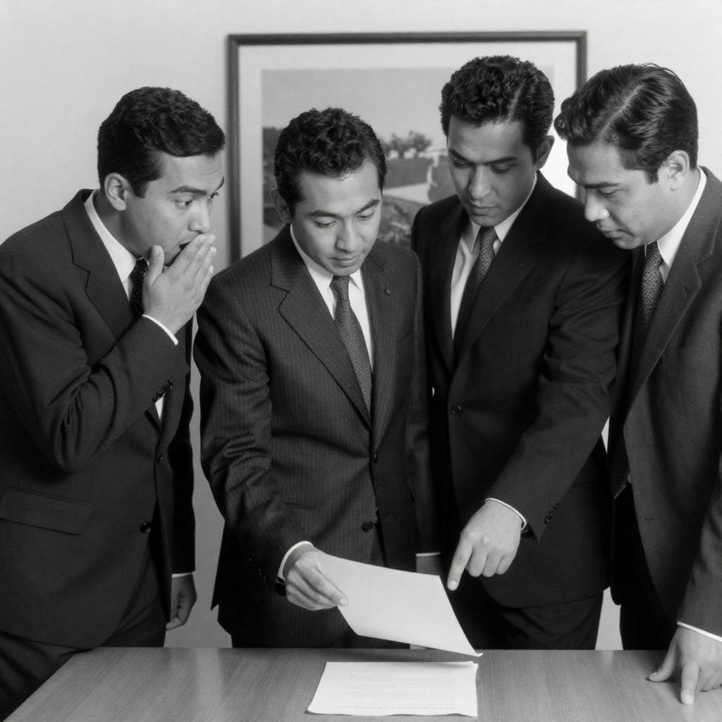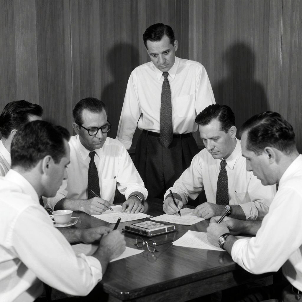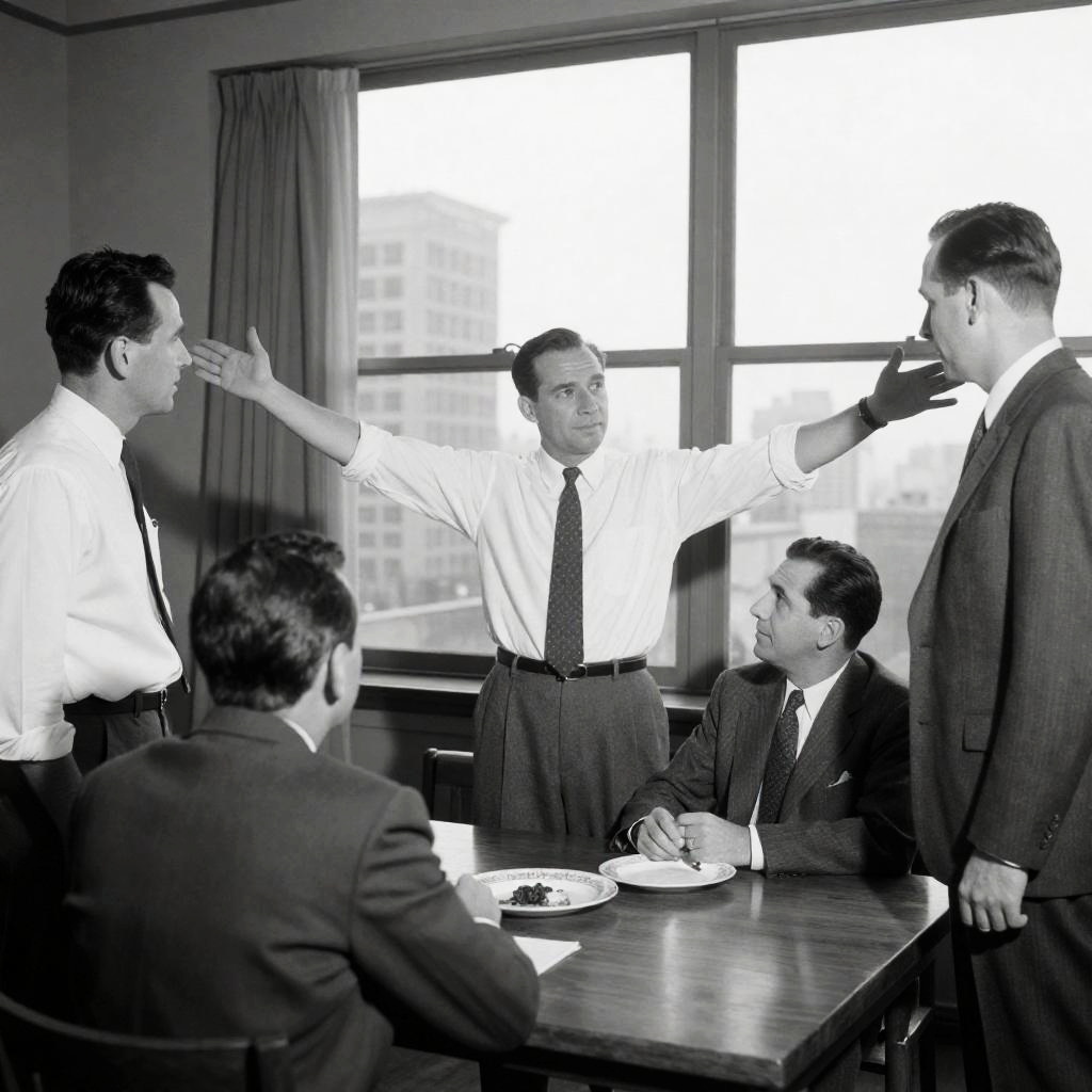 Black-and-white photograph of five men in a room. One man stands with arms outstretched, wearing a white shirt and tie, looking at another man in a suit sitting at a wooden table. Three other men stand around the table, facing the standing man. Cityscape visible through large windows in the background. Men in suits, one in a white shirt. Serious expressions. Objects on the table: plates and papers. Casual, mid-20th-century setting.