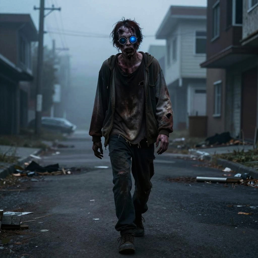 Zombie with glasses wandering through an abandoned urban street at dusk, tattered clothes, glowing eyes, eerie fog surrounding, cinematic lighting, detailed textures