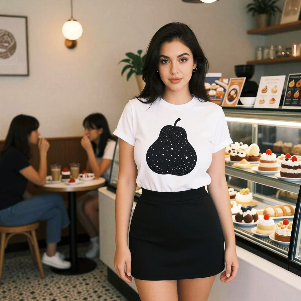 Photograph of a young woman with medium brown skin and black hair standing in a cozy café. She wears a white t-shirt with a black, glittery pear graphic and a black, high-waisted mini skirt. Behind her, two other women sit at a table, one with dark hair and a black top, the other with light brown hair and a black shirt. The café has a counter with a glass display filled with pastries and a potted plant on a shelf. Warm lighting and a framed picture adorn the white walls. The floor has a small, patterned tile design.