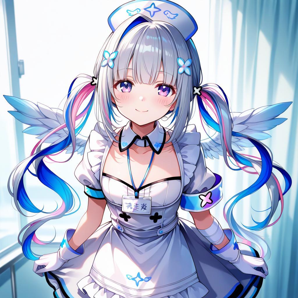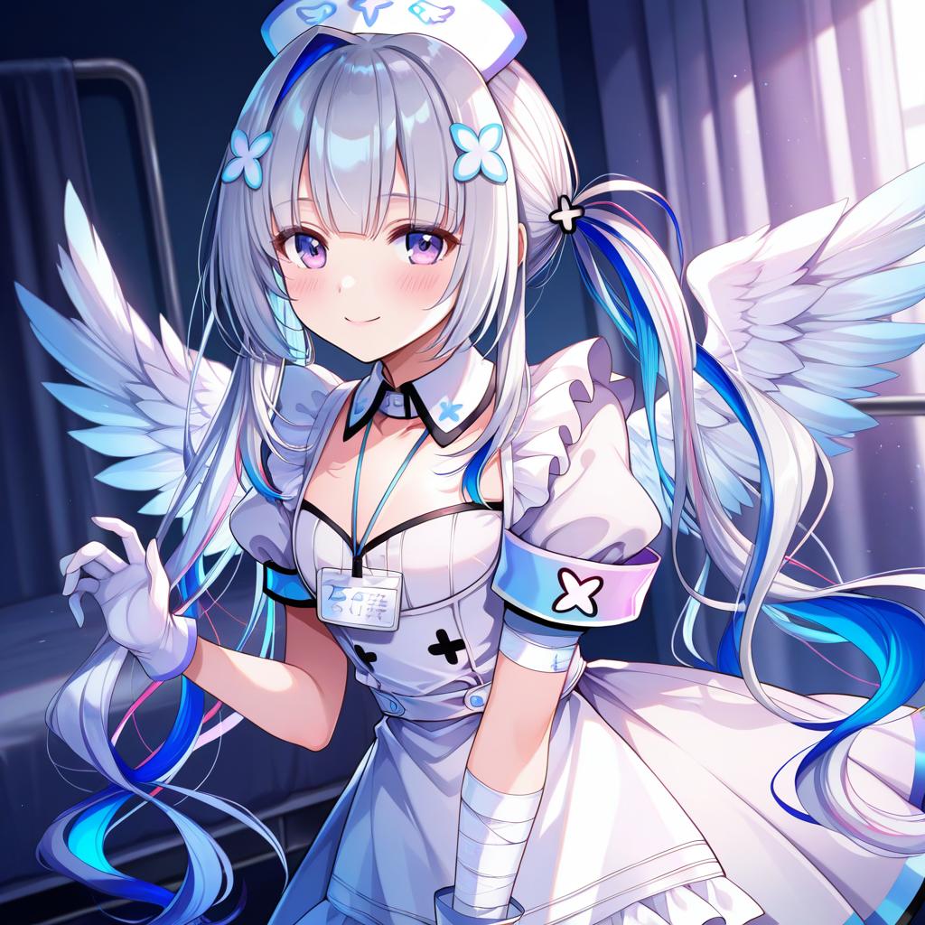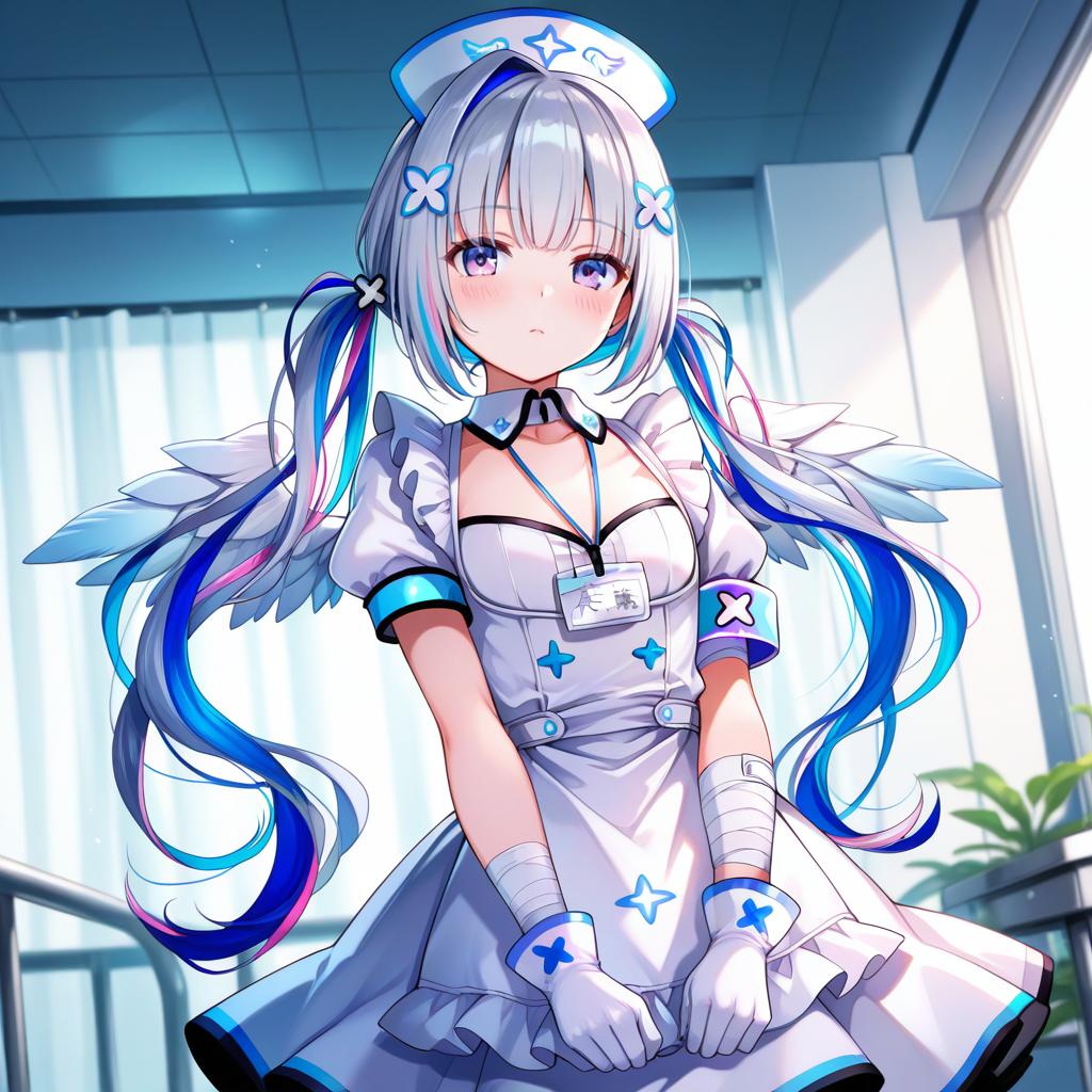 Amane kanata (nurse), hololive, 1girl, angel wings, angel wings, purple eyes, blue hair, grey hair, colored inner hair, single hair intake, official alternate hairstyle, streaked hair, official alternate hair length, long hair, pink hair, x hair ornament, twintails, blunt bangs, small breasts, flat chest, nurse cap, white gloves, white dress, white apron, detached collar, puffy short sleeves, virtual youtuber, virtual youtuber, feathered wings, feathered wings, nurse, nurse, bandaged arm, id card, armband, by artist kazu (muchuukai), illustrious