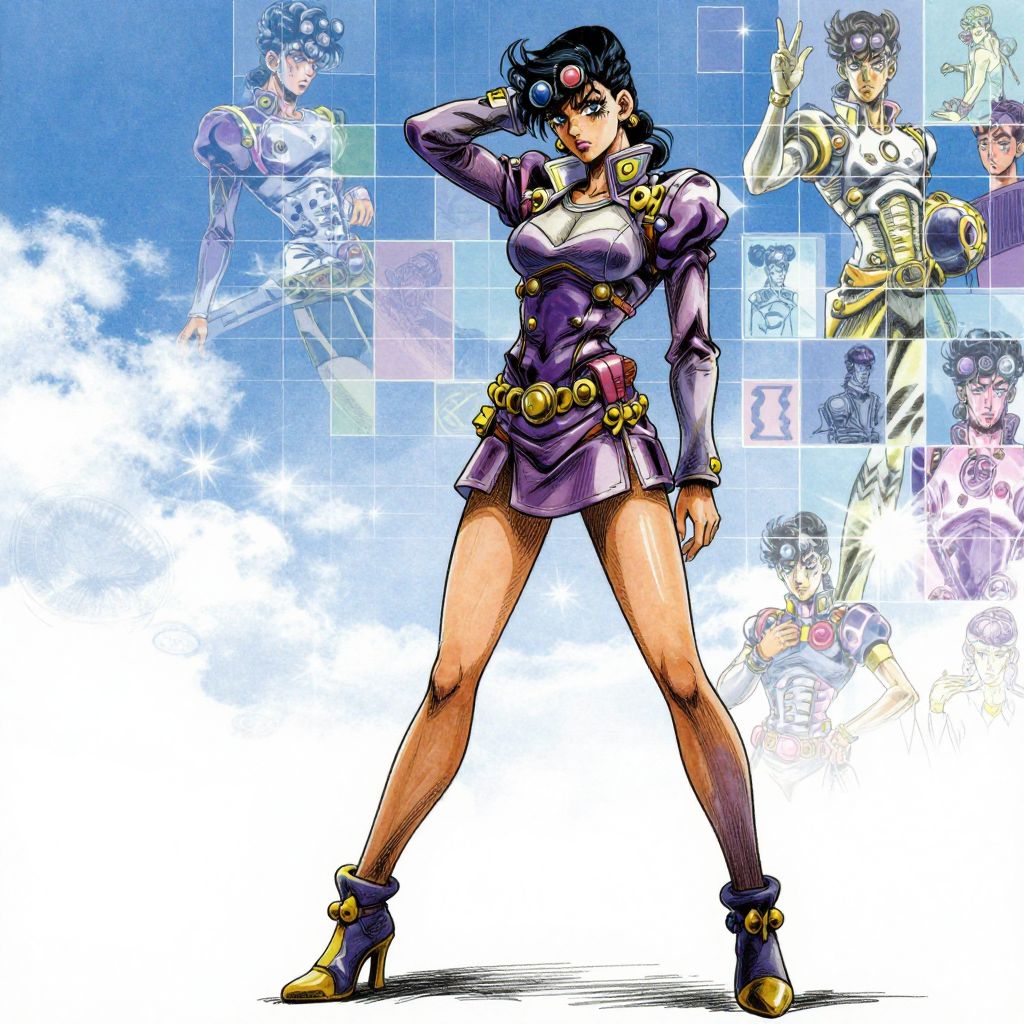Inksketch, FFAIM, A slender, long-legged Japanese woman adopts an unusual, eccentric pose reminiscent of the iconic poses of characters from Hirohiko Araki famous manga JoJo's Bizarre Adventure, Her pose demonstrates the model's boldness and confidence, exaggerated angles and dynamic artistic taste, The image conveys the model's elegance and uniqueness by combining fashion and anime aesthetics, making it both vibrant and avant-garde, The sky background is filled with a holographic grid of patterned figures drawn in cold colors, with a wintry atmosphere