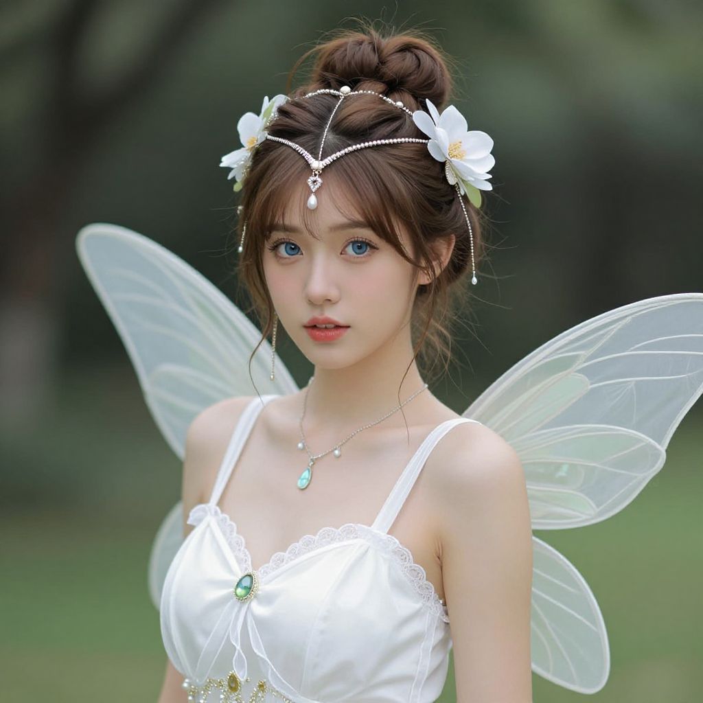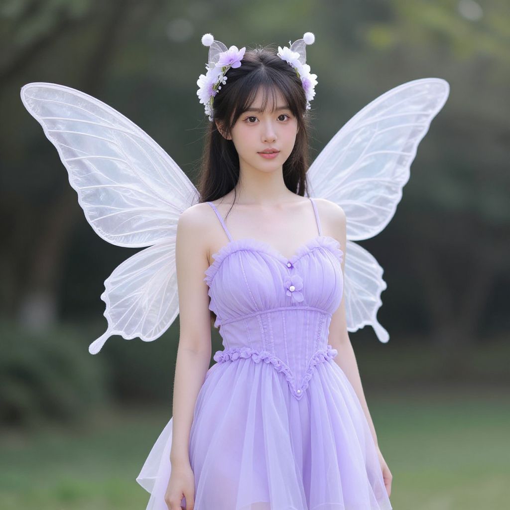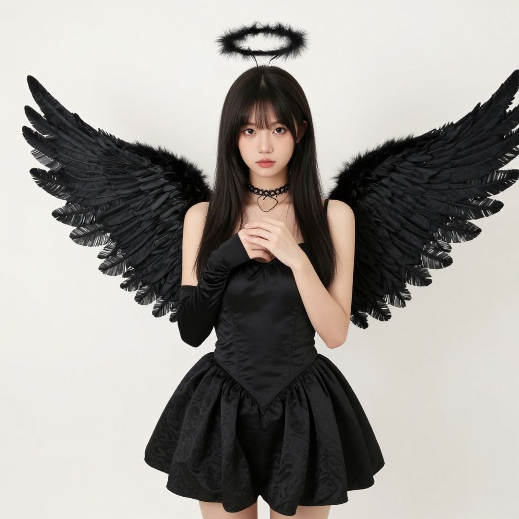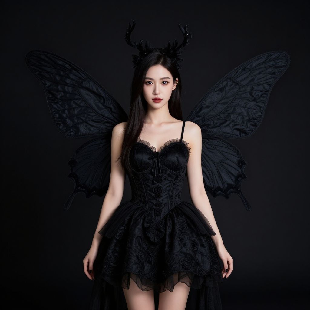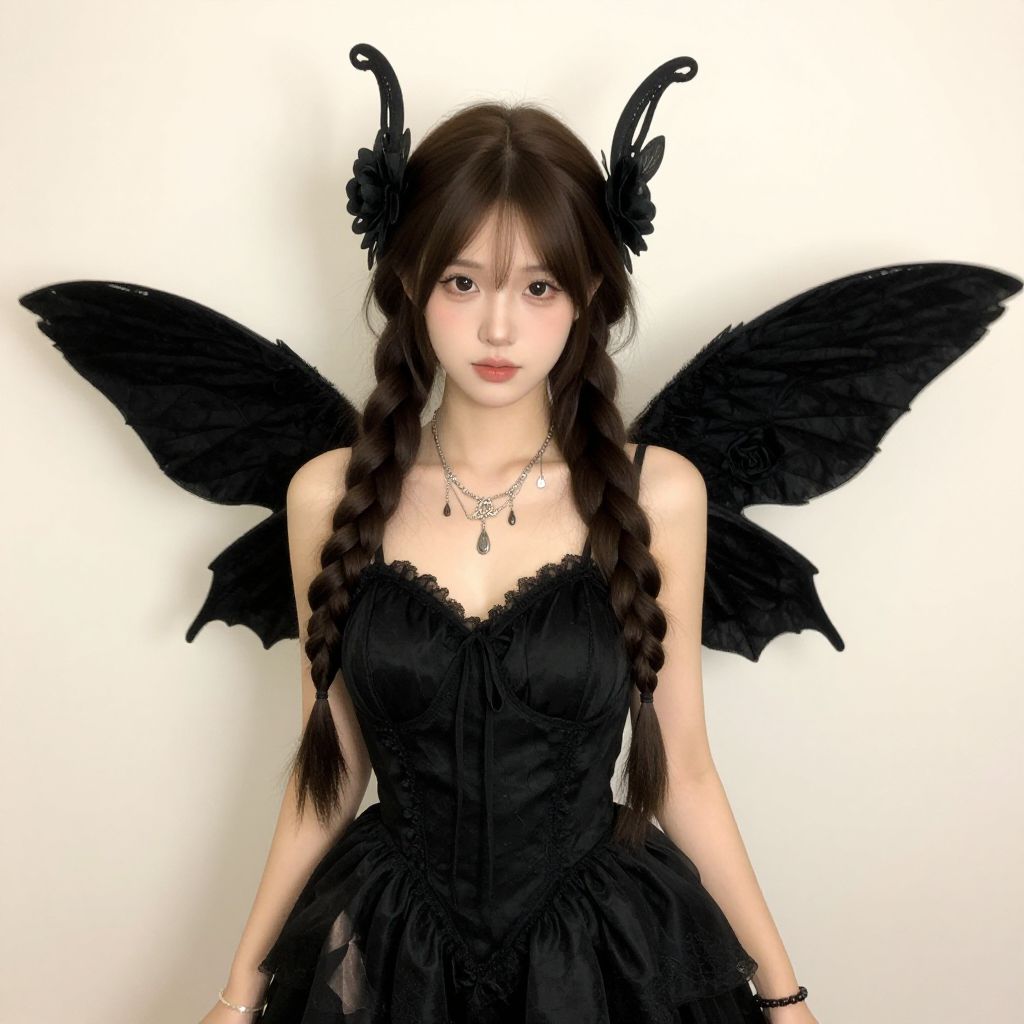 Photograph of a young Asian woman with pale skin and long, dark brown braided hair adorned with black floral hairpieces. She wears a black, strapless, lace-trimmed dress with a fitted bodice and a slightly flared skirt. Her large, black, wing-like accessories resemble bat wings, adding a gothic touch. She has delicate silver necklaces and subtle makeup, with a natural yet slightly ethereal appearance. The background is a plain, white wall, which contrasts with her dark attire. Her expression is neutral, and she stands facing the camera, centered in the frame.
