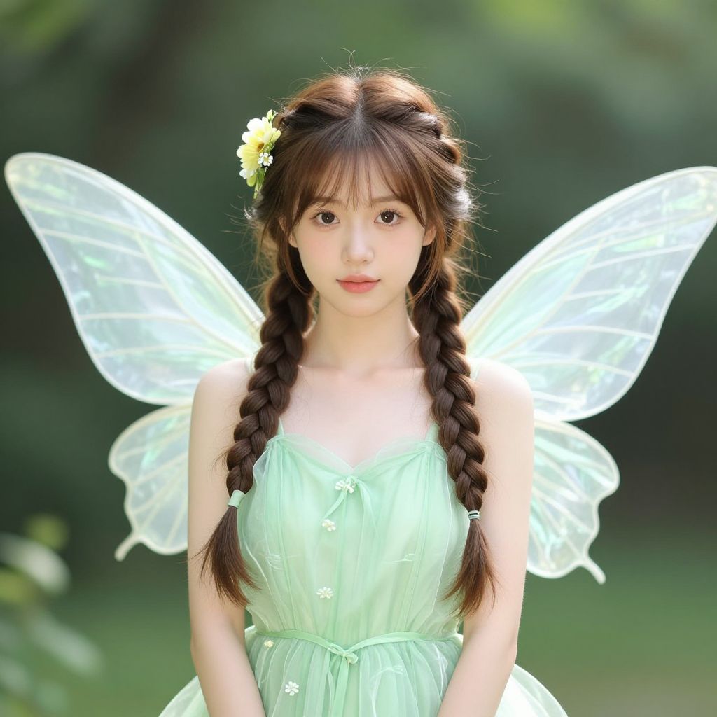 "dark fairy costume adult, 1girl, solo, dress, long hair, wings, jewelry, black dress, brown hair, insect wings, flower, realistic, twin braids, braid, bracelet Realistic photo of casual sexy person with pretty face"