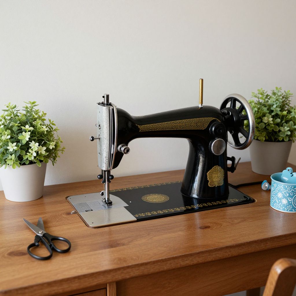Vintage sewing machine rests elegantly on a wooden table, surrounded by potted plants, scissors, and decorative items, evoking a nostalgic and cozy atmosphere.