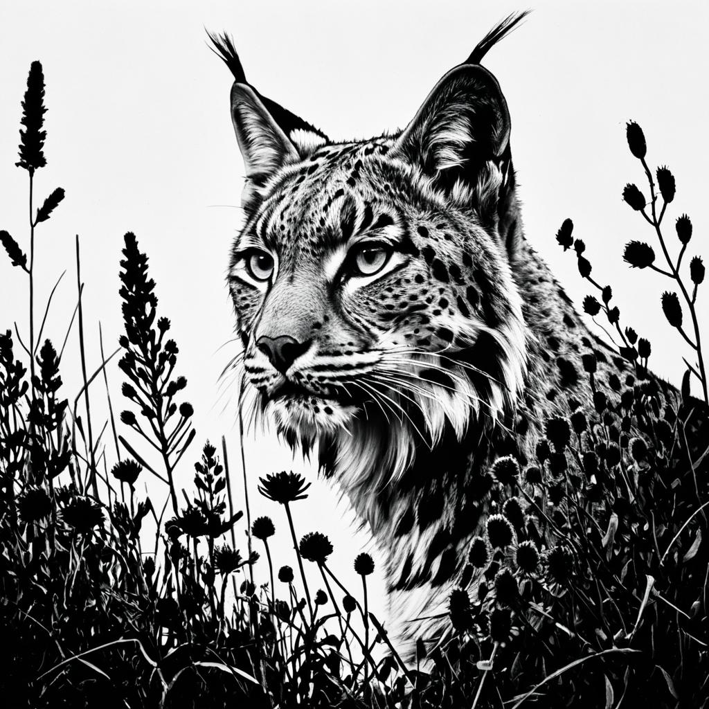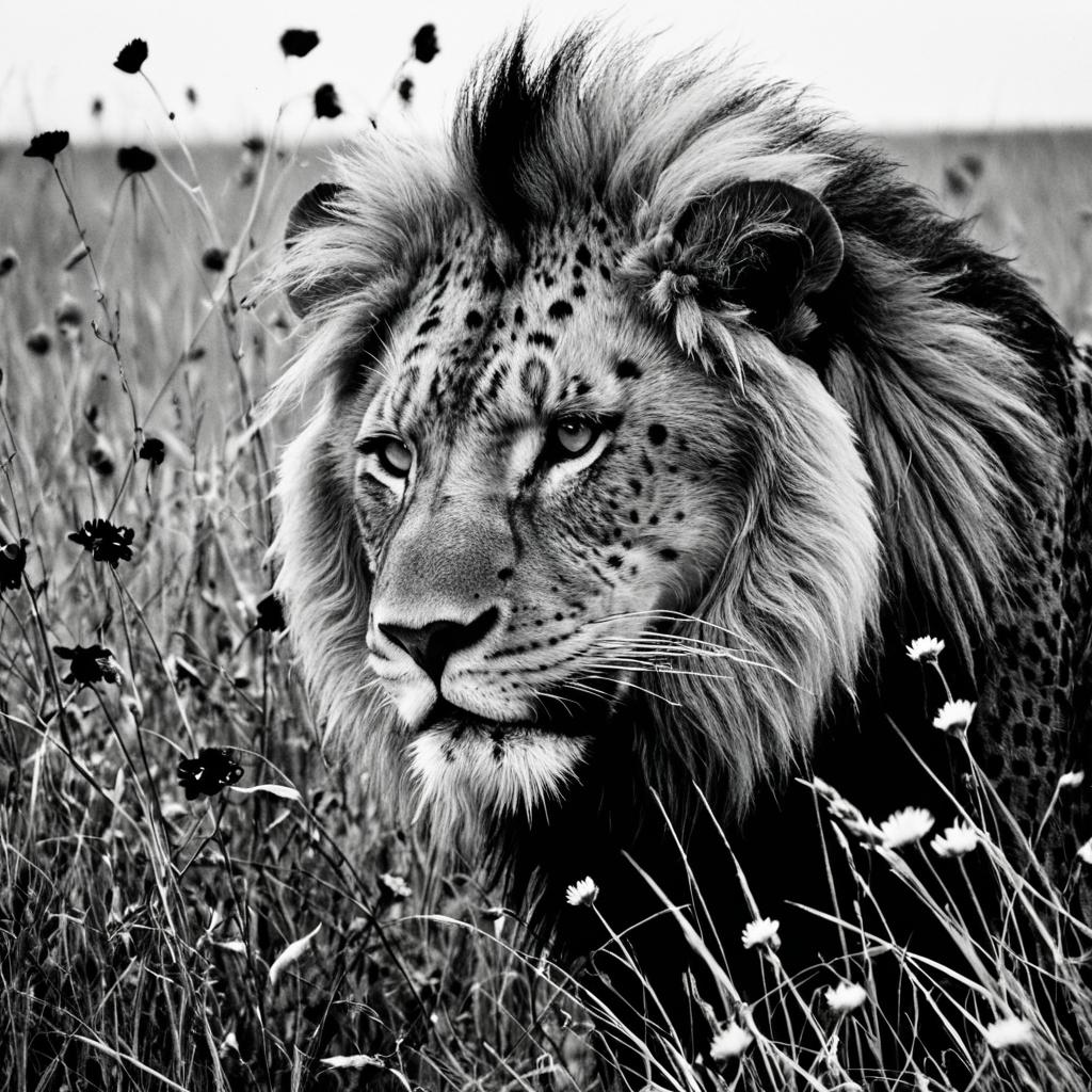 Black and white close-up image of a lion in a grassland setting. The lion has a detailed mane and spotted fur pattern resembling a jaguar. The scene includes silhouettes of dried flowers and grasses, capturing a natural and symbolic atmosphere with artistic influences.