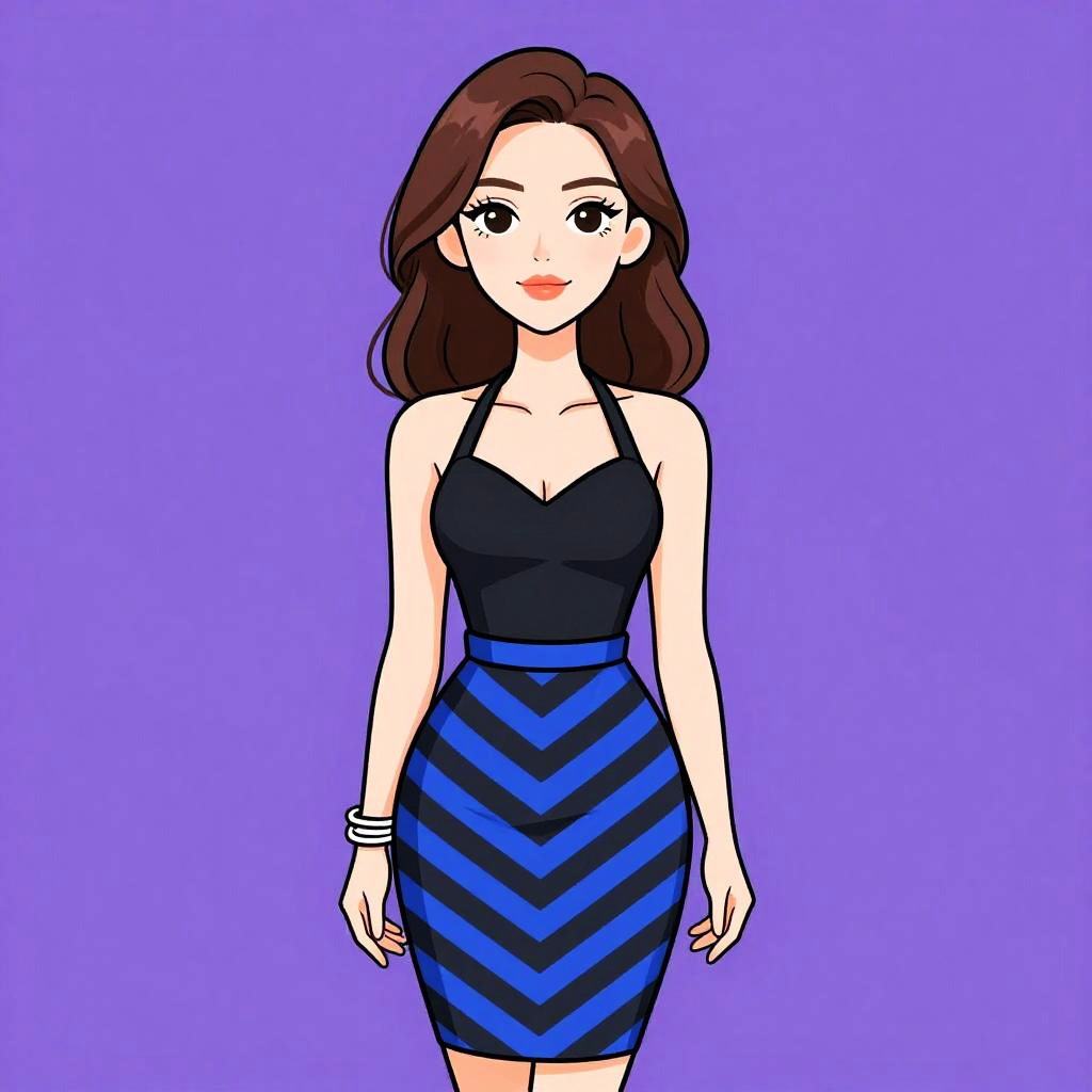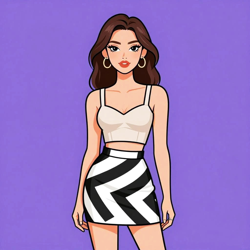 Woman with pretty face and pretty hair. Woman, trendy fashion, sleeveless crop top in a neutral shade with a sweetheart illusion neckline, geometric cut-outs, paired with a high-waisted skirt featuring bold black and white geometric patterns, mini skirt length, straight-cut silhouette. --sref 1467