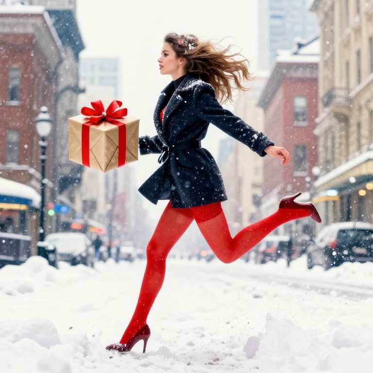 Photograph of a blonde woman with wavy hair, sitting on a large green gift box adorned with a red ribbon in a snowy urban street. She wears a black long-sleeve top, red thigh-high stockings, and black high heels. Snowflakes fall around her, and several red and green wrapped gifts with bows are scattered in the snow-covered ground. The background shows blurred buildings and pedestrians, creating a festive, winter atmosphere. Her thoughtful expression and the contrasting colors of her outfit against the snowy setting add visual interest.