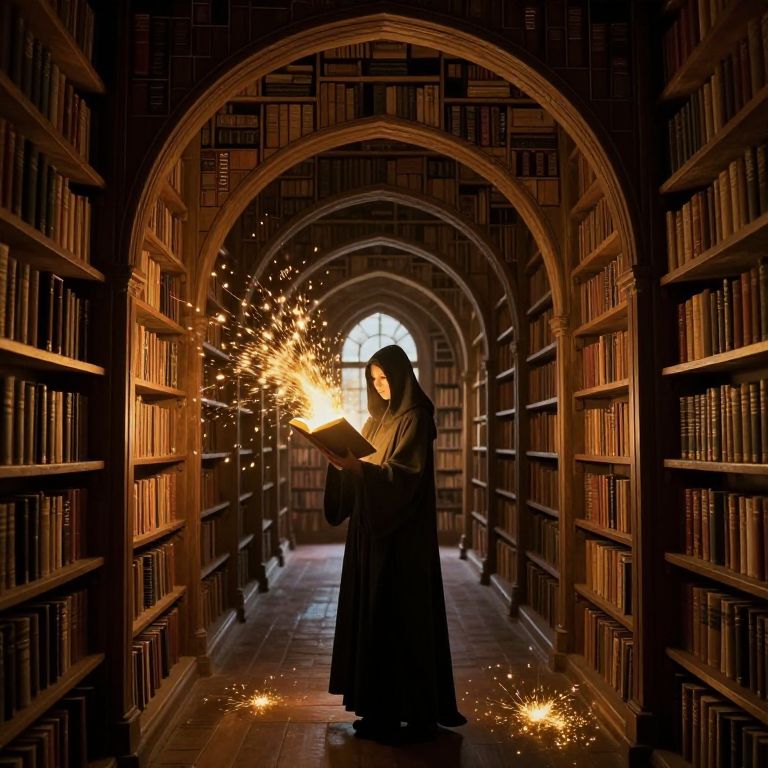 In a labyrinthine library of infinite arches, a cloaked figure holds a glowing tome that ignites a cascade of golden sparks, illuminating the path where books and light intertwine in a mystical dance.
