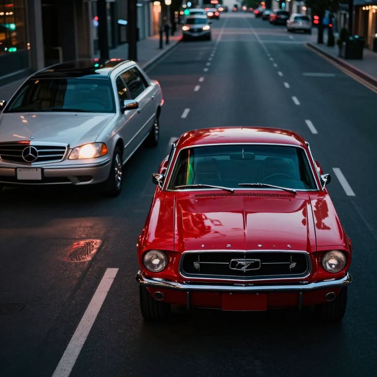 Photograph of a vibrant red classic Ford Mustang driving on a city street at night, flanked by a silver Mercedes-Benz. City lights and other cars