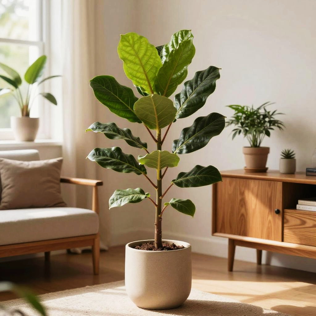 Monstaria growing in a serene indoor space, mid-century modern room with natural light, cozy atmosphere featuring wooden furniture and potted plants, warm color palette emphasizing the plant's glossy broad leaves, realistic photography style