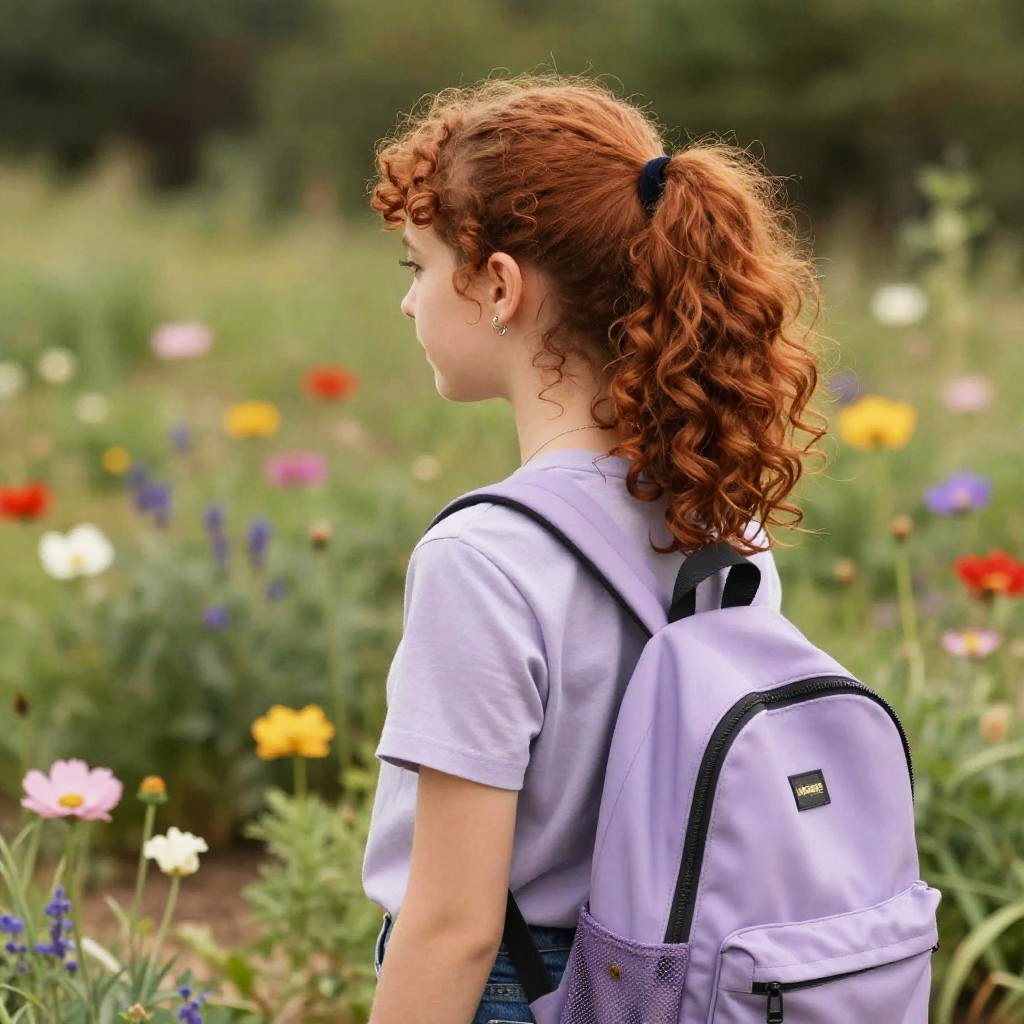 Curly ponytail, red girl with lavender t-shirt and backpack standing in a field of flowers