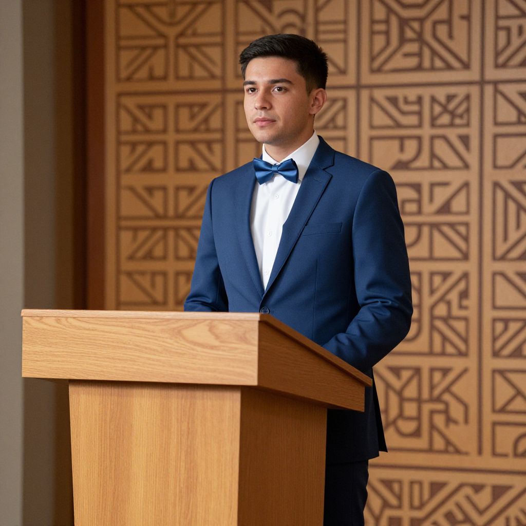 A confident man in his 30s wearing a tailored blue suit with a crisp white shirt and a subtle blue bow tie stands upright in front of a wooden podium. The podium is slightly elevated, with clean lines and a polished finish. Behind him, a patterned wall features intricate geometric designs in warm earth tones, adding depth and visual interest to the scene. The lighting is soft and natural, coming from the side, highlighting his features and the texture of the wood and fabric. The overall atmosphere is formal and elegant, suggesting a speech or presentation setting.