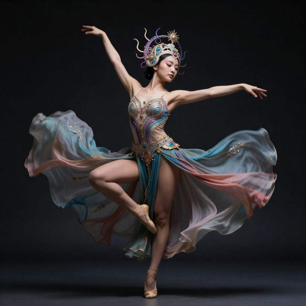 Mystical dancer of exhilaration, intricately detailed and hyper-realistic, with vibrant color enhancement and exceptional sharpness, creating a breathtaking composition, award-winning, ultra-high definition.
