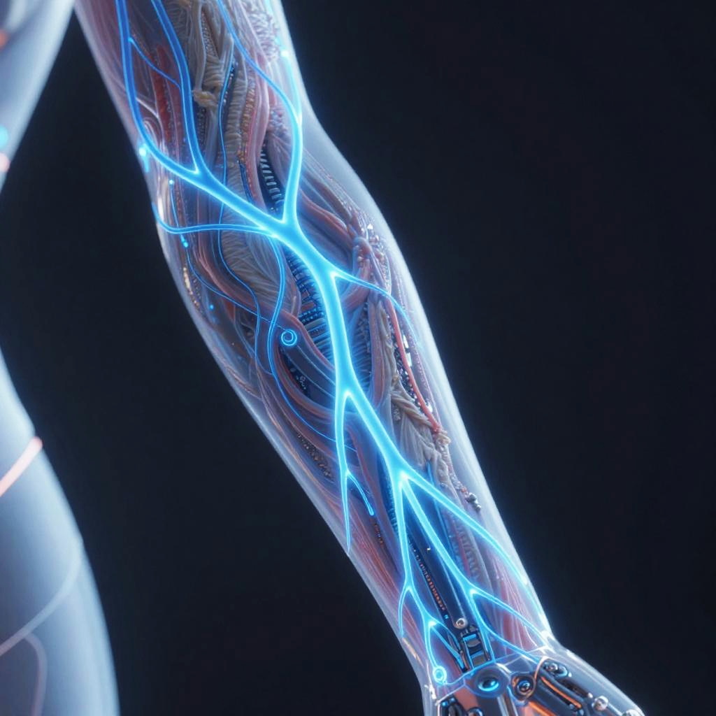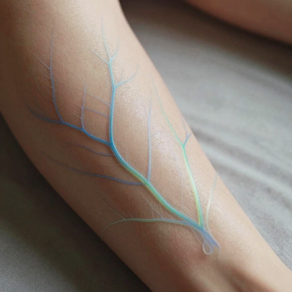 Translucent skin veins glowing subtly under soft natural light, close-up of human arm displaying intricate network of blue and green veins visible through semi-transparent skin, highly detailed, realistic medical illustration style, soft focus background, high resolution