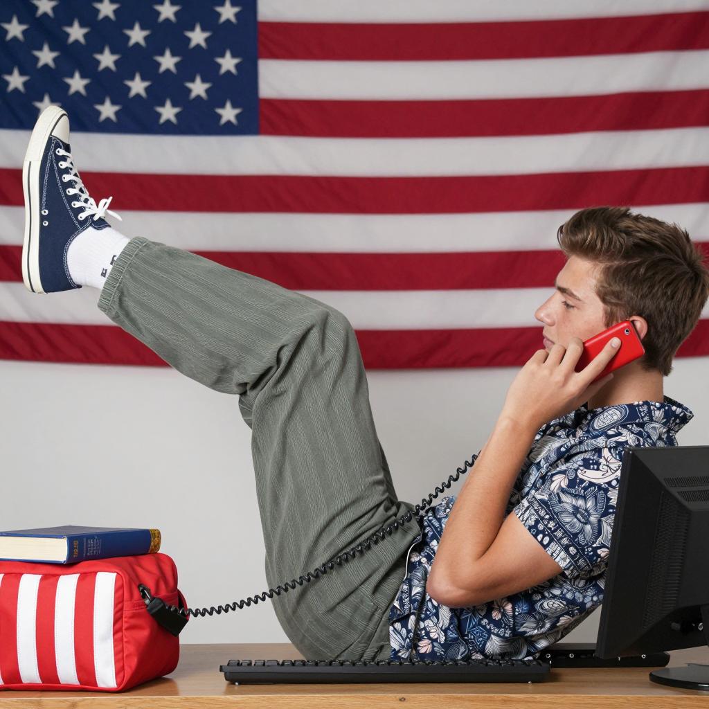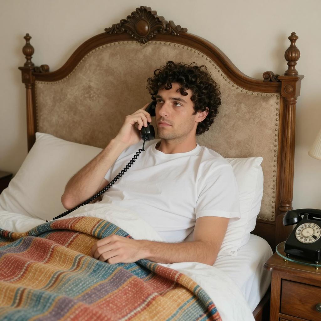 Man lying on a narrow white bed, wearing beige shirt and pants, white socks, and holding a black corded phone to his ear. White brick wall background, legs raised and resting against the wall. Relaxed posture, eyes closed, neutral expression. Pillow under head.