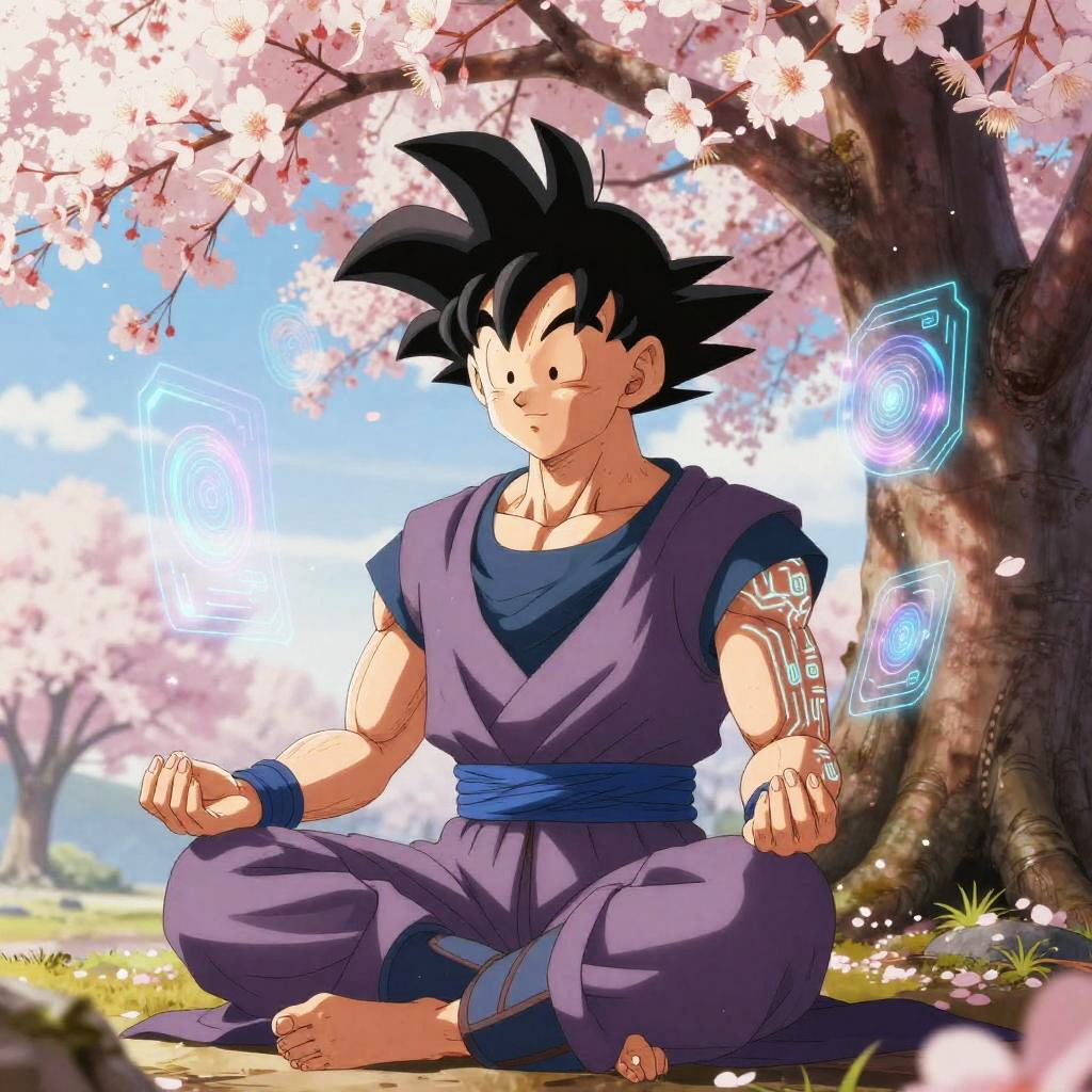 Dbz ai art illustrating a serene moment of a character meditating under a digital cherry blossom tree, glowing circuit patterns on skin, soft ambient lighting in pastel colors, fusion of traditional anime aesthetics with sci-fi AI elements and holographic projections