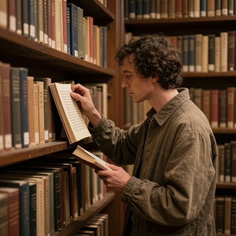 Photograph of a young white man with curly dark brown hair, wearing a greenish-brown, slightly worn, button-up shirt, standing in a library. He is holding an open book against a tall wooden bookshelf filled with variously colored hardcover books. He is focused, with his right hand resting on the shelf and his left hand holding the book. The background is filled with more bookshelves, creating a warm, wood-paneled ambiance. The lighting is soft, highlighting the man's profile and the texture of the books and shelves.