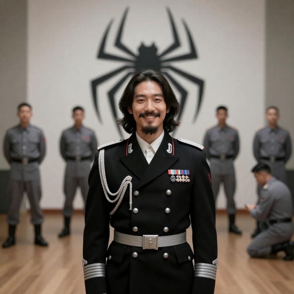 Man with long dark hair and mustache, wearing black military uniform with silver epaulettes and medals, smiling. Large spider emblem on white backdrop. Four soldiers in gray uniforms standing in background. Wooden floor, dimly lit. Another man kneeling to the right.
