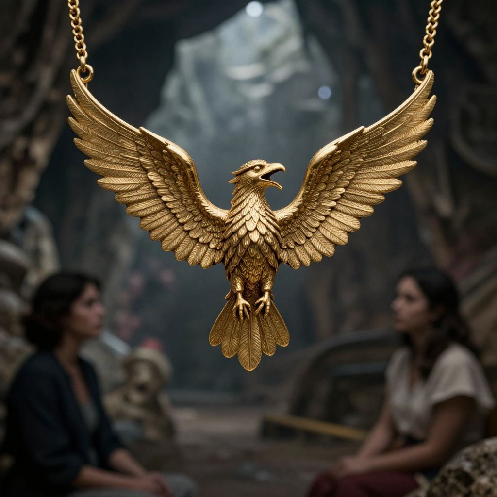 Photograph of a golden eagle pendant with outstretched wings, hanging from a chain in a dimly lit cave. The pendant glows with a metallic sheen, contrasting against the dark, rocky background. Two blurry, dark-haired women with medium skin tones sit on either side, slightly out of focus, adding depth to the scene. The cave's textured walls and faint light at the top create a mystical atmosphere. The pendant's intricate detailing is highlighted by the light, emphasizing its craftsmanship. The image blends realism with a slightly magical, ethereal quality.