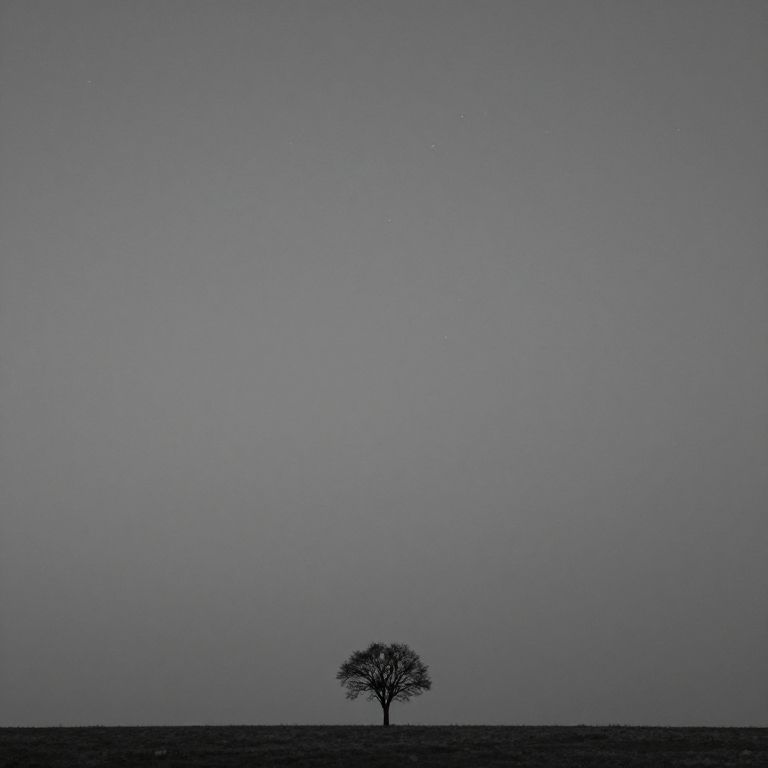 An abstract representation of the emotion loneliness, visualized as a vast, empty sky with scattered, faint stars and a small, lone tree against a dusky background, emphasizing solitude and emptiness.